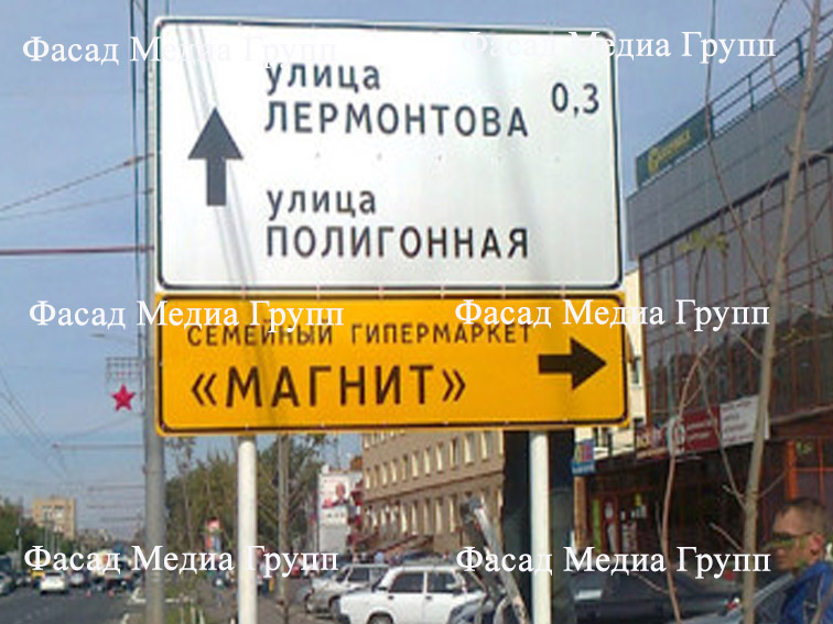 В условиях городской среды размещение информации о компании на дорожных указателях является эффективным средством продвижения бренда организации, поддержания внимания к вашему бизнесу, привлечения новых клиентов и удержания старых покупателей и заказчиков. Именно дорожные указатели, установленные на улицах города, помогают горожанам найти вас и купить необходимые товары или заказать услуги. Для размещения рекламы на дорожных знаках обращайтесь в рекламное агентство «Фасад Медиа Групп». Будем рады сотрудничеству.