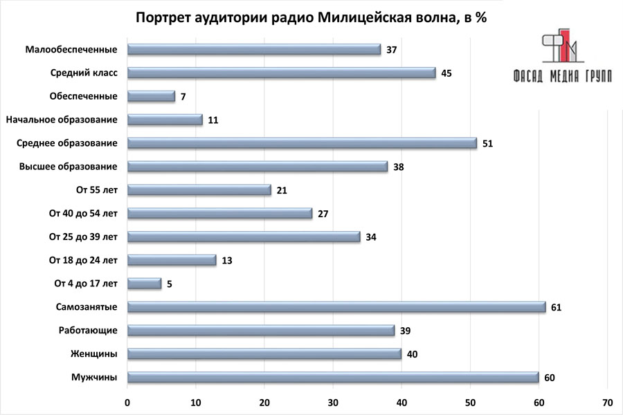 Реклама на радио «Милицейская волна» в Новокузнецке ориентирована на самый широкий круг людей. Вместе с тем, радиостанция транслирует разный контент, ориентированный на различную публику. Следовательно, рекламодателю необходимо знать целевую аудиторию рекламируемого товара или услуги, чтобы разместить рекламу на радио «Милицейская волна» с максимальным эффектом. В решении данной задачи вам помогут специалисты «Фасад Медиа Групп».