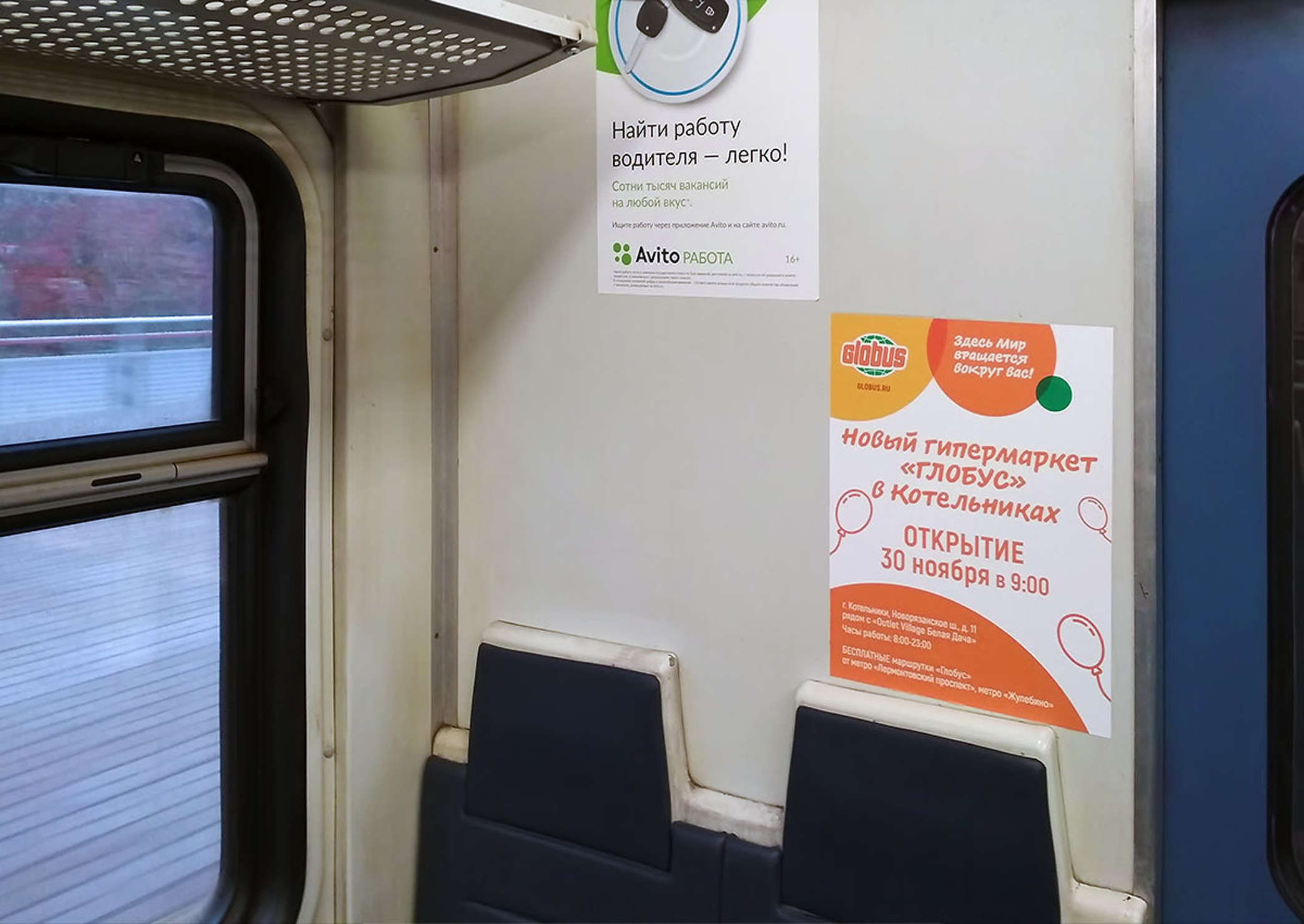 Постеры для рекламы в электричках мы советуем печатать на скроллерной бумаге или на полиэтилентерефталатной пленке.