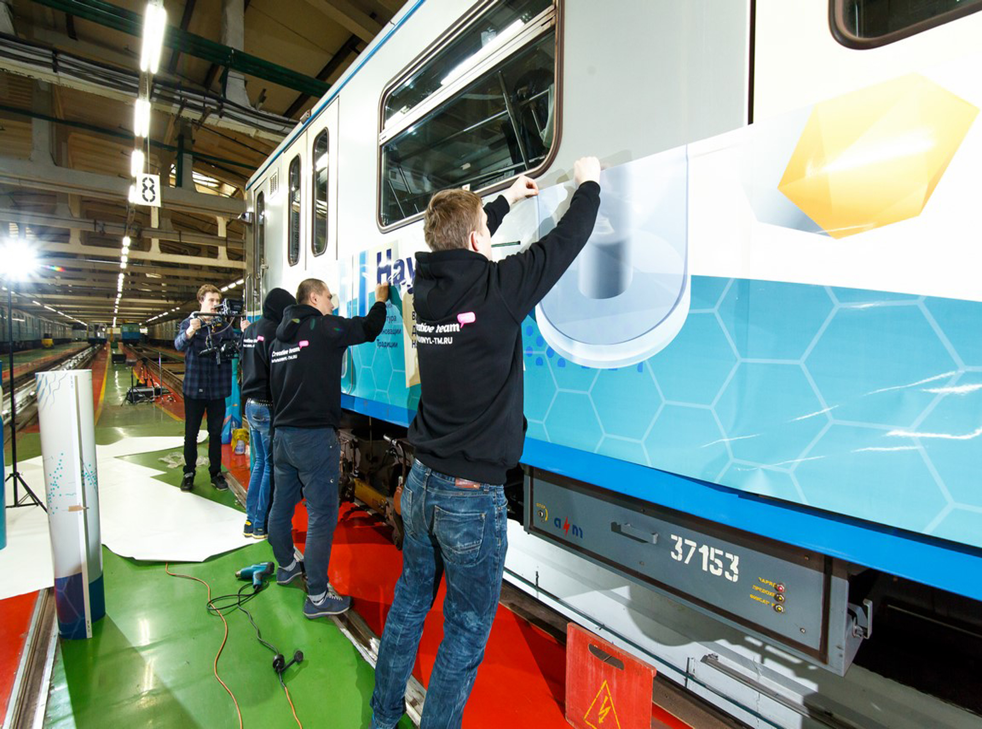 Пример брендирования электричек самоклеящейся пленкой представлен на фото: