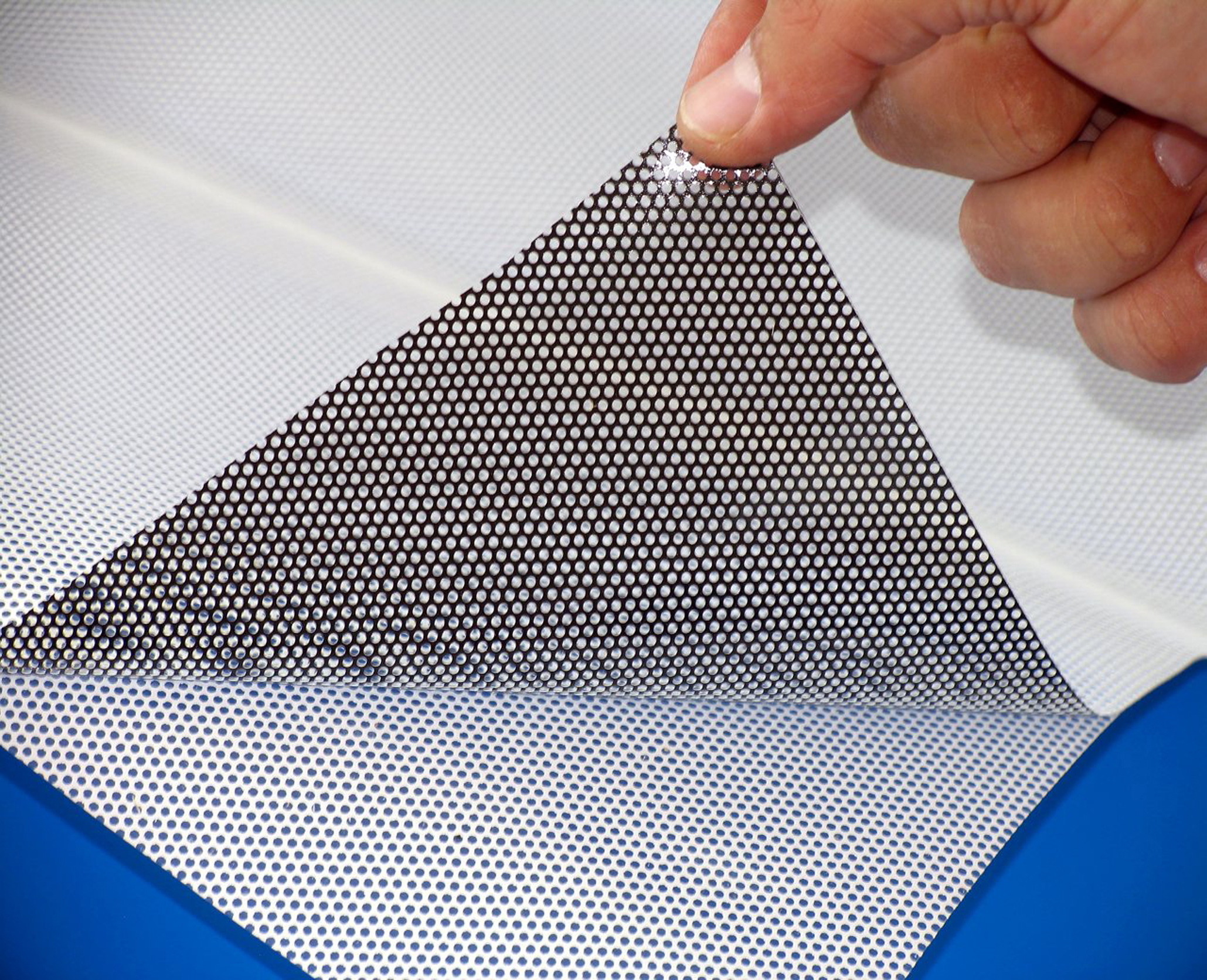 Перфорированная пленка представляет собой ПВХ-пленку с клеевым слоем и перфорационными отверстиями, занимающими до половины всей ее площади. Перфорированная пленка используется для оклейки стекол вагонов электрички.