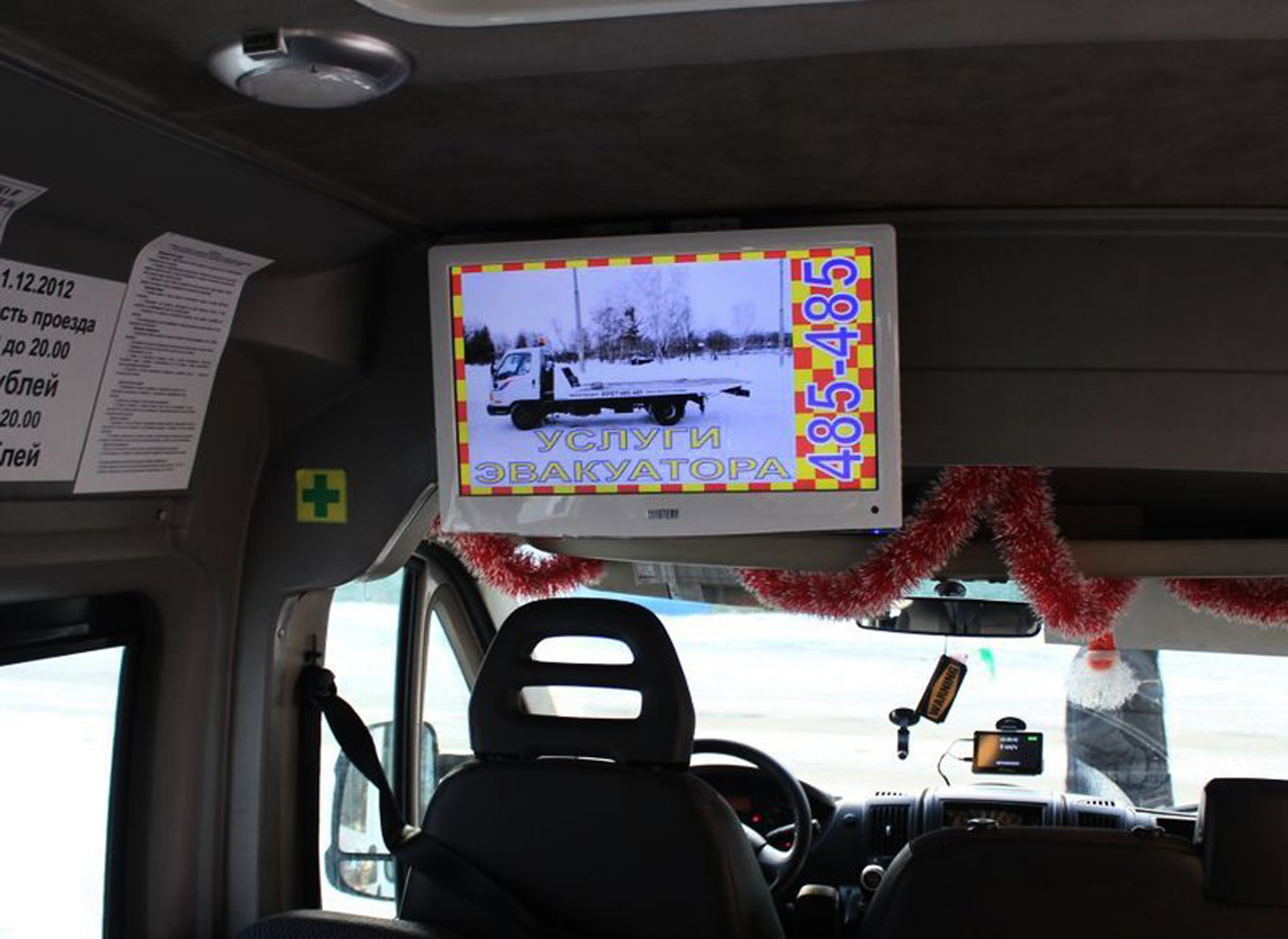 Дополнительно необходимо отметить, что реклама на маршрутках в Новокузнецке может быть представлена рекламным видеороликом. В этом случае вместо монтажа рекламы следует говорить о начале трансляции рекламы.