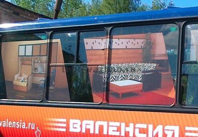 Приводим примеры монтажа рекламы на/в междугородних автобусах: