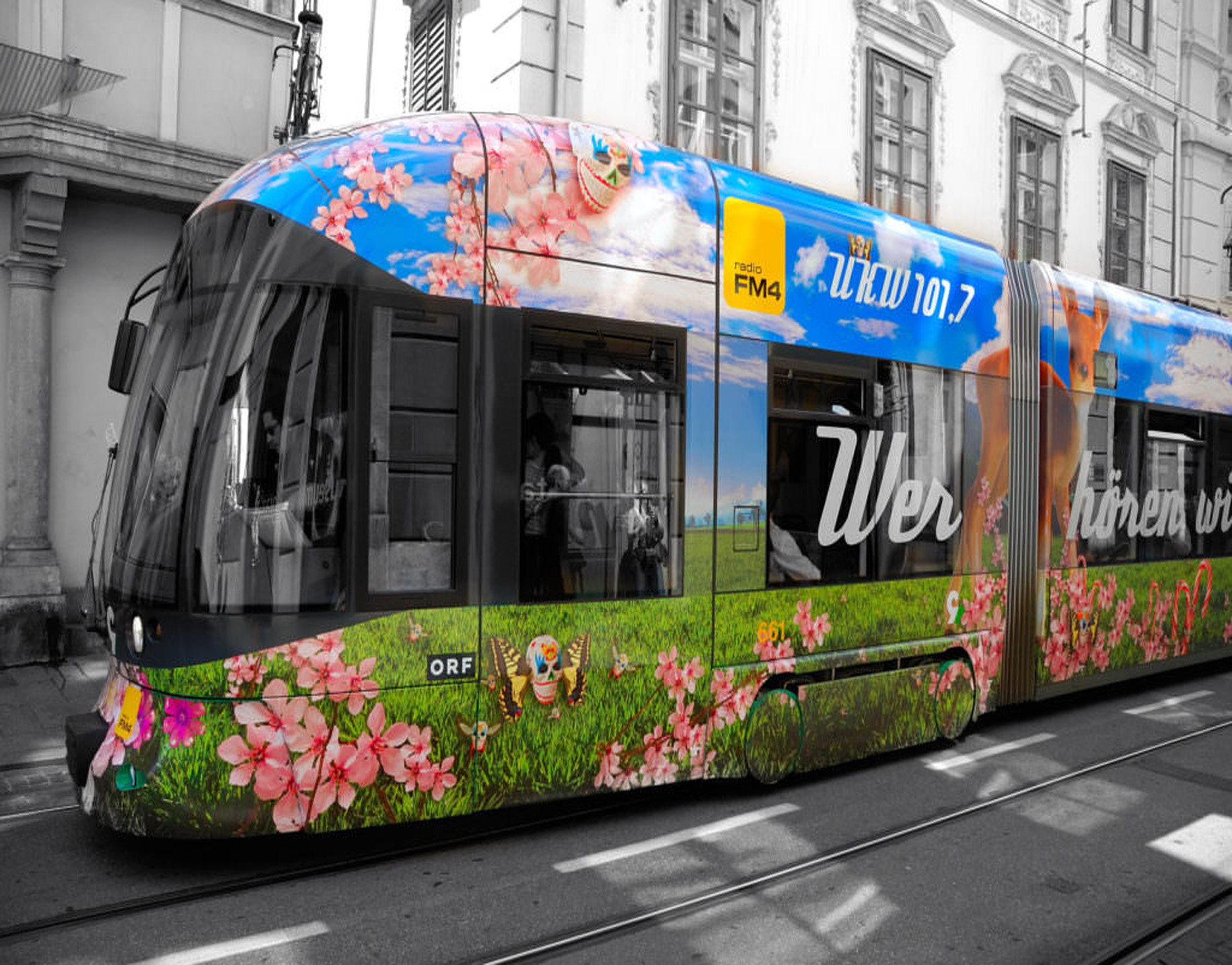 Пример брендирования стекол трамвая перфорированной пленкой: