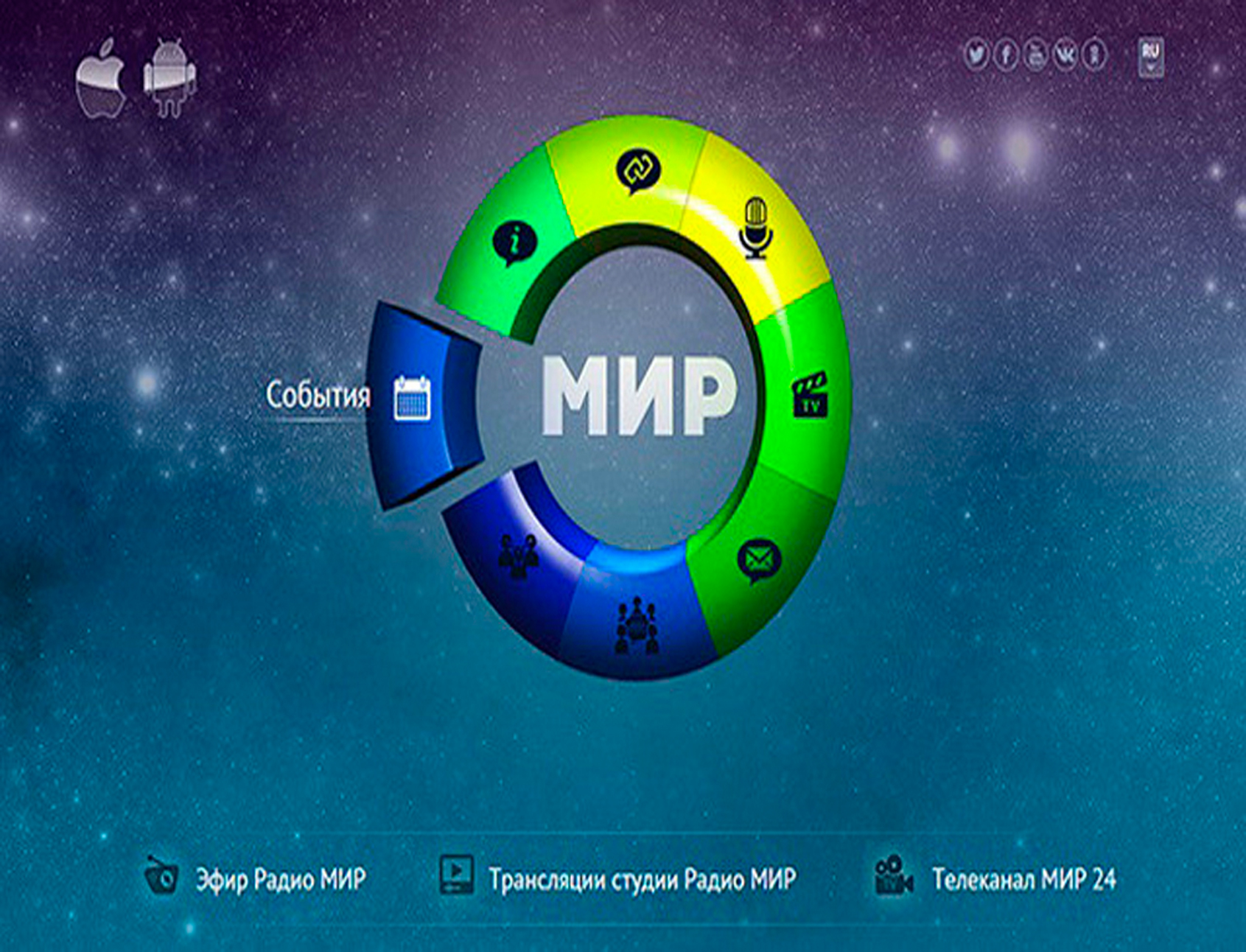 Мир – это международная телерадиокомпания (МТРК), которая была основана соглашением глав государств-участников СНГ 9 октября 1992 г. В состав МТРК «Мир» входят телеканалы «Мир», «Мир 24», «Мир HD», радиостанция «Мир», а также информационно-аналитический портал «MIR24.TV». Головной офис находится в Новокузнецке; филиалы и представительства – в 9 странах СНГ. Вещание осуществляется на русском языке. Председателем МТРК «Мир» и руководителем одноименного канала является Радик Батыршин. С 2017 г. слоганом МТРК «Мир» является фраза: «Телеканал многих столиц».