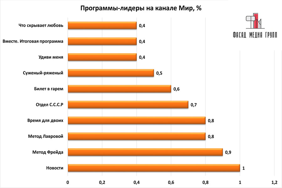 Популярность телеэфира на «Мир» приводит к ежегодному увеличению спроса на рекламное время. Для привлечения клиентов из разных регионов России, увеличения процента продаж, повышения имиджа компании и узнаваемости бренда – размещайте рекламу на «Мир». «Мир» – это проверенный и востребованный канал для размещения рекламы на новокузнецком ТВ. Для размещения рекламы на телевидении обращайтесь в рекламное агентство «Фасад Медиа Групп». Будем рады сотрудничеству.