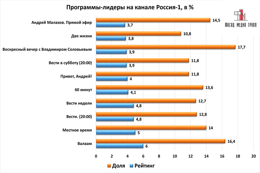 В телесезоне 2016-2017 годов, помимо общественно-политического вещания, «Второй канал» сделал ставку на различные шоу талантов: вместе со вторым сезоном «Синей птицы» были запущены проекты «Удивительные люди». Сетка вещания канала «Россия-1» состоит из рейтинговых передач, которые всегда собирают большую зрительскую аудиторию. Рекламодатели должны учитывать данный благоприятный факт при выборы эффективного ресурса для размещения рекламы.