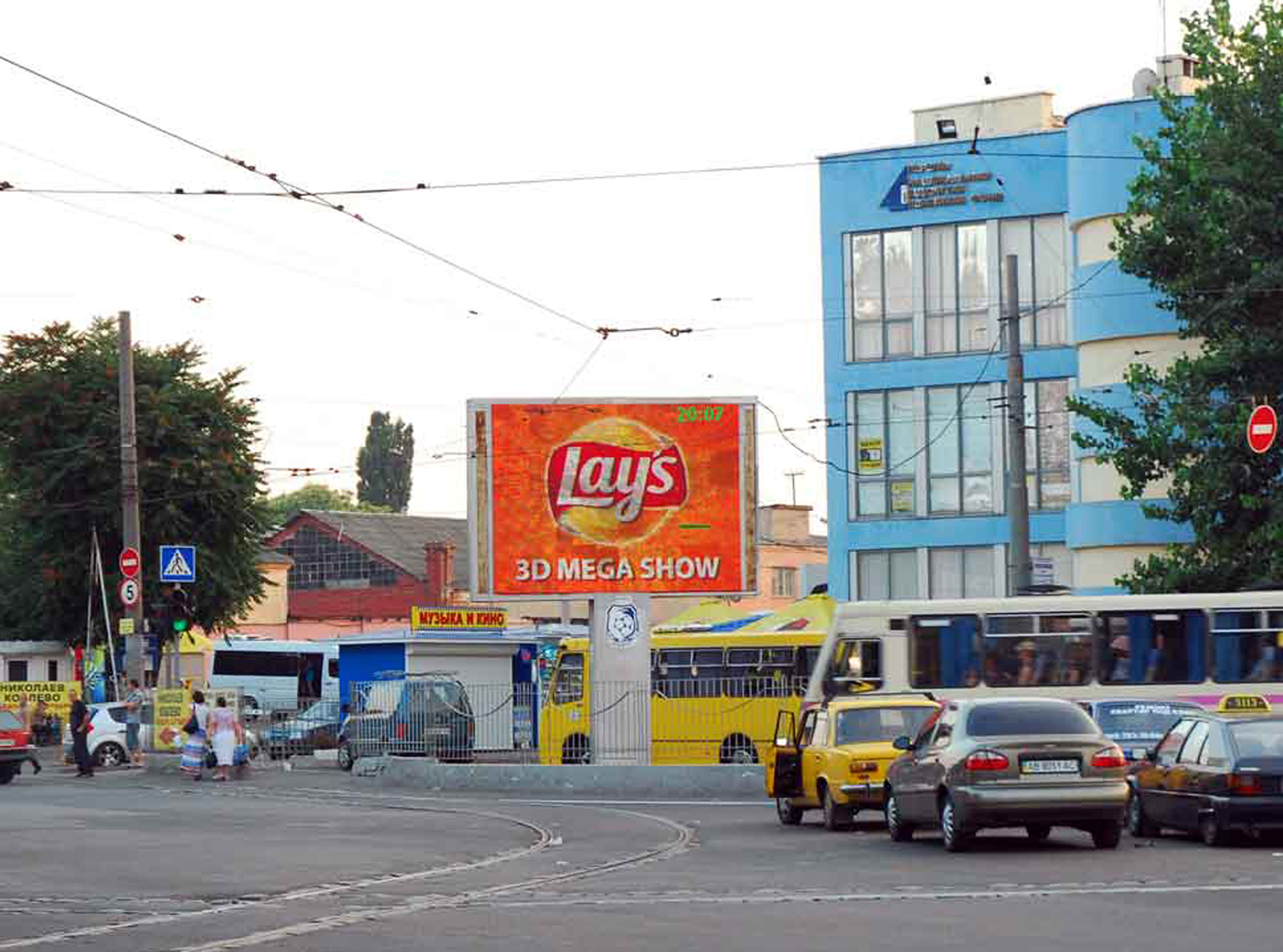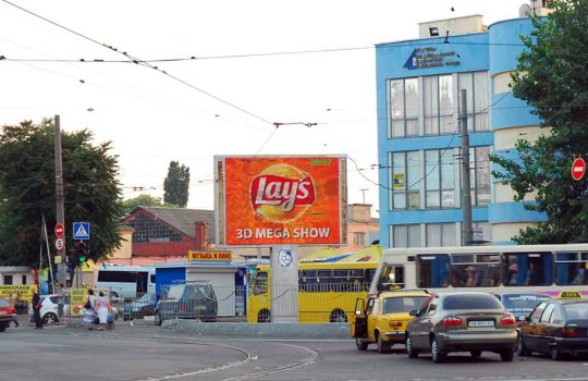 Пример рекламы на видеоэкране возле здания автовокзале:
