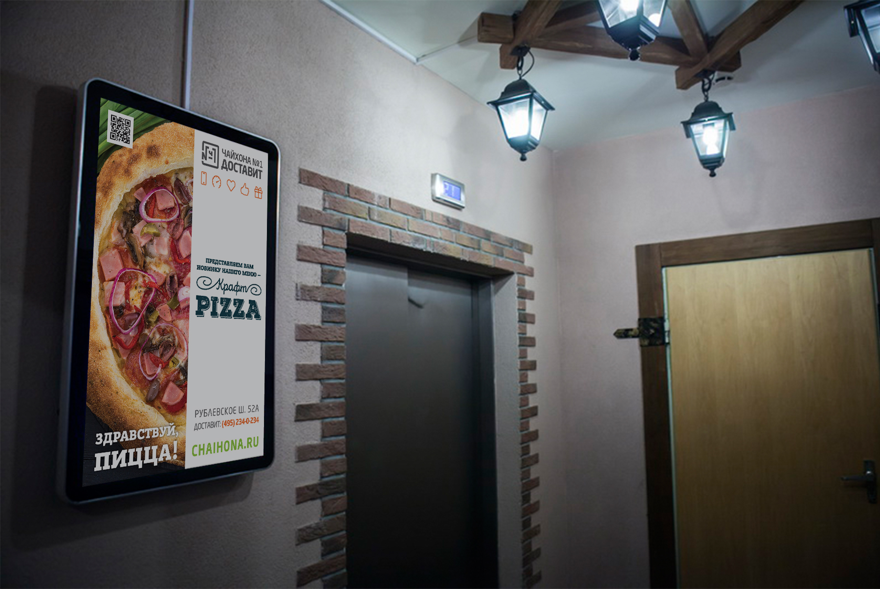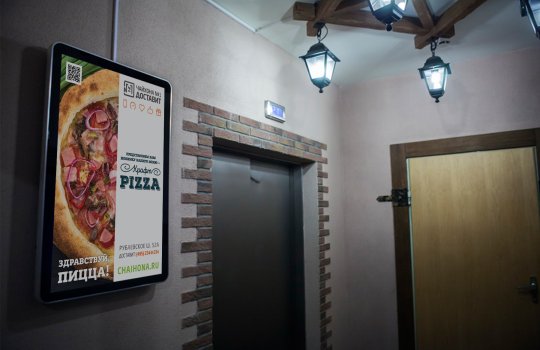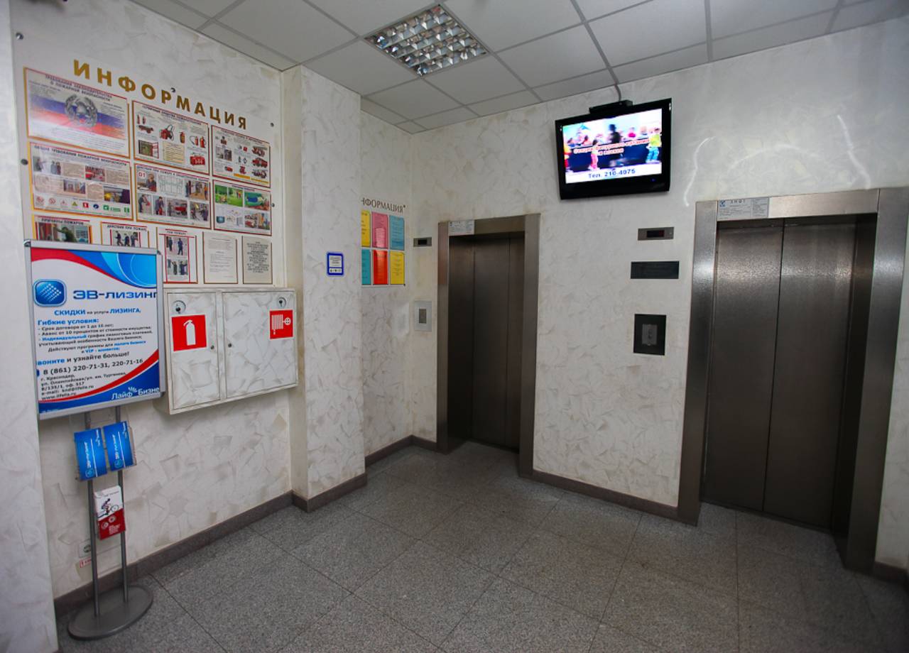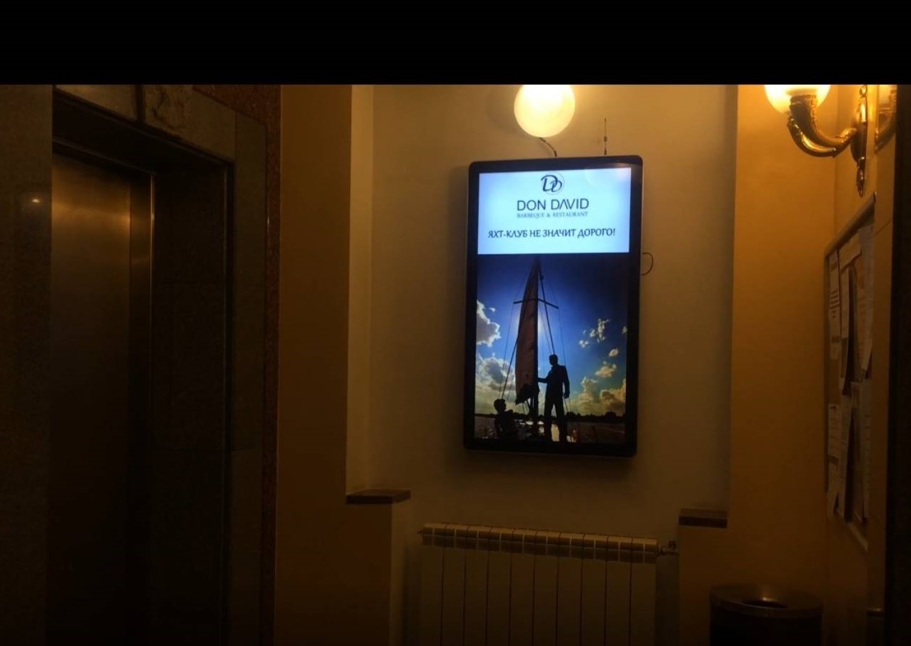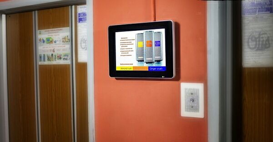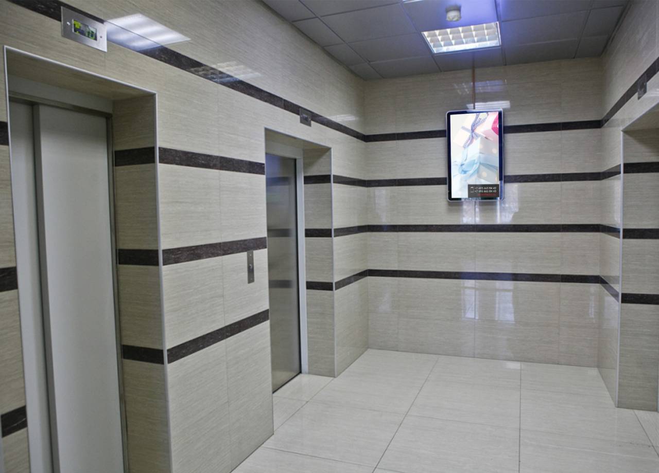 Пример рекламы на мониторах в предлифтовых холлах: