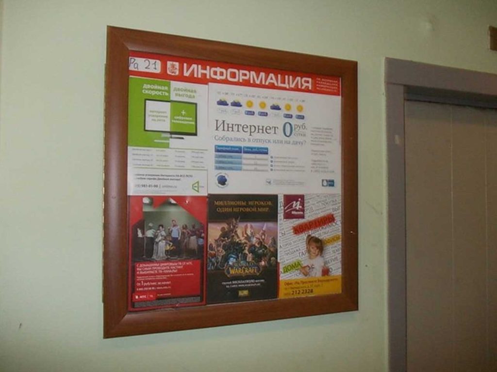 Многие дома в городах оборудованы информационными стендами, которые установлены в подъездах. Практически в каждом подъезде установлен информационный стенд , на котором размещаются рекламные материалы. Однако возникает вопрос: каким образом рекламные материалы монтируются на информационном стенде? Размещение рекламы в подъездах осуществляет наше рекламное агентство, т.к. у нас заключены соответствующие договоры с управляющими компаниями, ТСЖ и т.д. Специалисты Фасад Медиа Групп производят монтаж рекламы применяя специальные крепежные инструменты для информационного стенда.