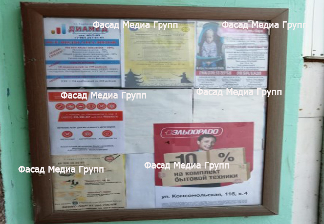 Пример рекламы на информационном стенде в подъезде: