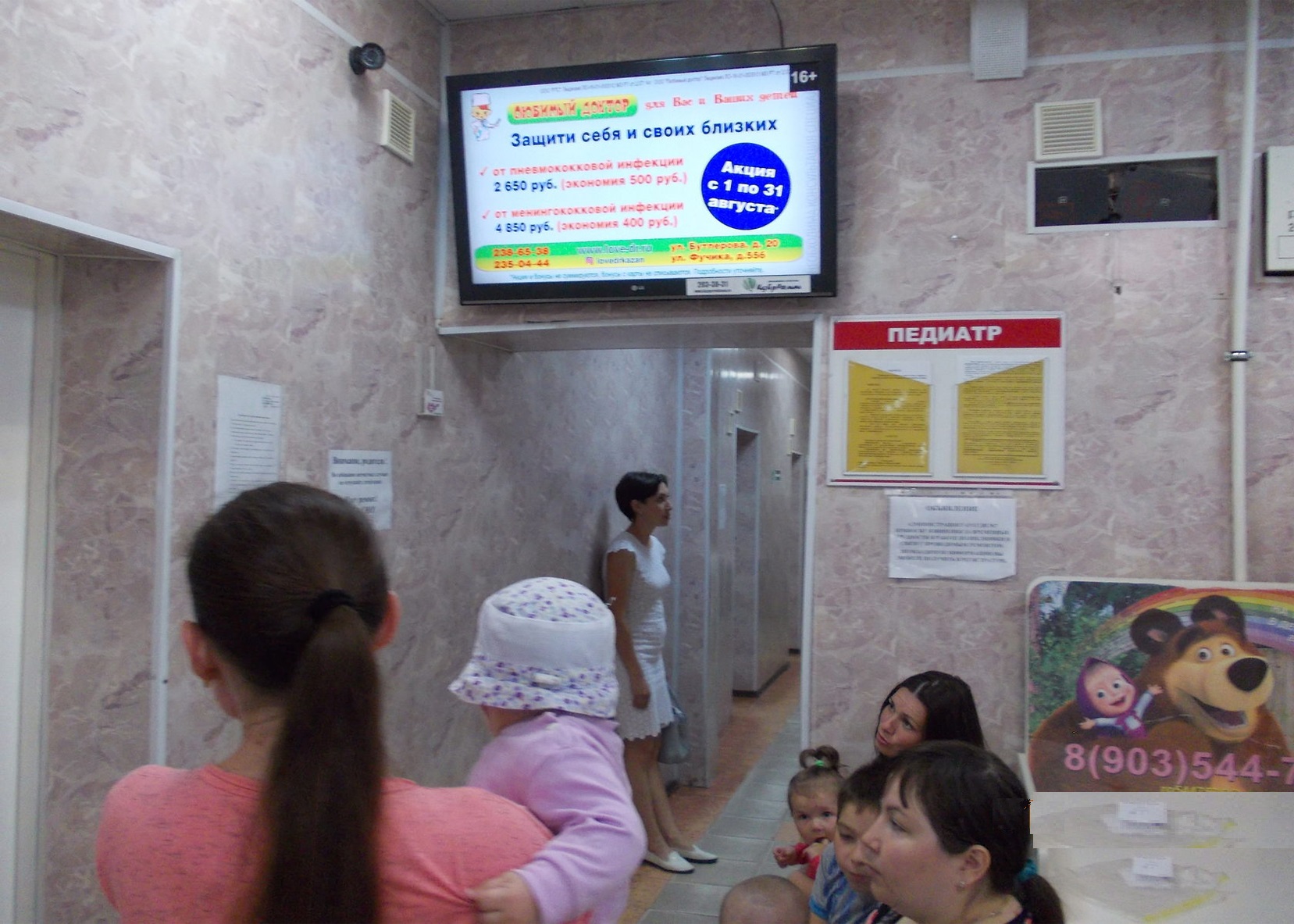 Напомним, что рекламу в поликлиниках в Новокузнецке можно разместить как в виде плаката, стикера, листовки, флаера, холдера, так и запустить трансляцию рекламного ролика на мониторах.
