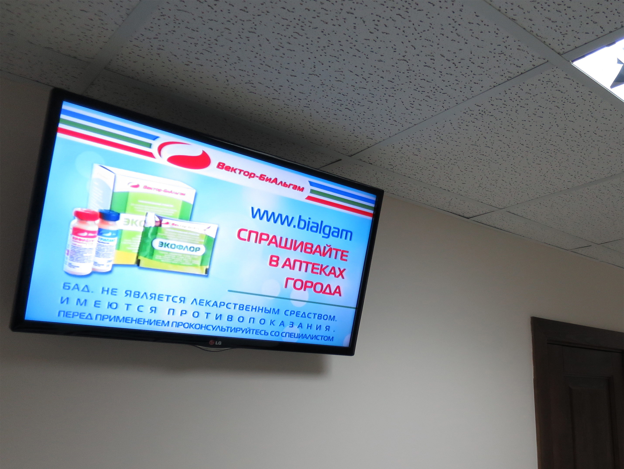 Дополнительно необходимо отметить, что реклама в поликлиниках в Новокузнецке может быть представлена рекламным видеороликом. В этом случае вместо монтажа рекламы следует говорить о начале трансляции рекламы.